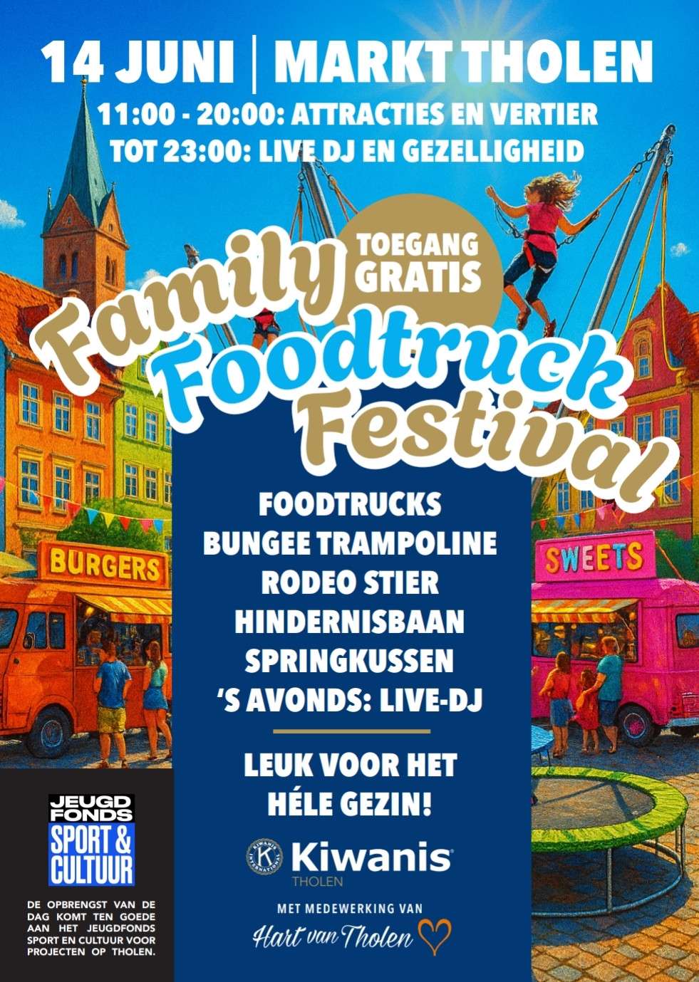 Kiwanisclub Tholen houdt zaterdag 14 juni 2025 op de Markt in Tholen een foodtruck festival. Van 11.00 uur tot 20.00 uur staan er diverse foodtrucks klaar met lekkernijen voor elk wat wils. Daarnaast kunnen de bezoekers zich uitleven op een bungee trampoline, een rodeostier, een hindernisbaan en een springkussen.